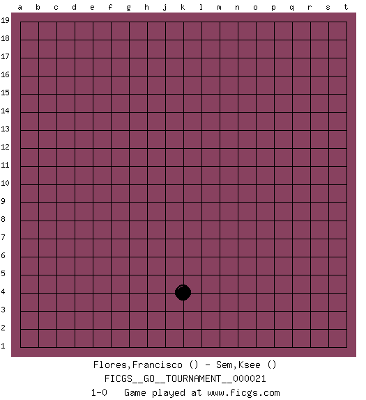 Last move : 1-0 2018 September 26 3:39:48 [Event "FICGS__GO__TOURNAMENT__000021"] [Site "FICGS"] [Date "2018.08.08"] [Round "1"] [Black "Flores,Francisco"] [White "Sem,Ksee"] [Result "1-0"] 1.k4 1-0 This go game has been lost on time (started : 2018.08.08 22:53:22) Here are the names of the openings (joseki) played in the four corners : Player Black won this Go (weiqi, baduk) game. Follow this game move after move (download)Learning josekis by heart is useless if you don't try departing from them. (Pierre Audouard) Crush them ! Make them suffer ! (General Grievous in Star Wars ep.3)
