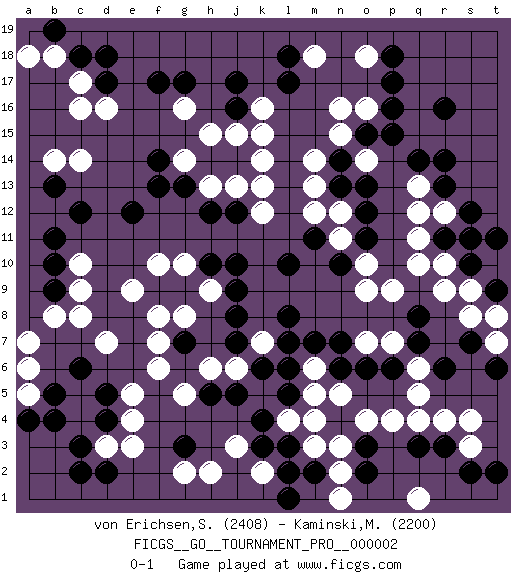 Last move : 0-1 2007 November 30 12:24:34 [Event "FICGS__GO__TOURNAMENT_PRO__000002"] [Site "FICGS"] [Date "2007.05.16"] [Round "1"] [Black "von Erichsen,Svante Carl"] [White "Kaminski,Marek"] [Result "0-1"] [Rating 1 "2408"] [Rating 2 "2200"] 1.r16 d16 2.d4 q4 3.f17 c14 4.d18 c17 5.j17 q10 6.o3 m3 7.r3 r4 8.q3 p4 9.o2 n5 10.c6 q13 11.p16 d3 12.c3 e3 13.c2 e4 14.d5 f6 15.q8 o9 16.p6 o4 17.n7 o7 18.o6 p7 19.n6 q6 20.l6 m5 21.q7 p9 22.l8 m6 23.m7 k7 24.l7 k5 25.l10 k16 26.j16 k15 27.h14 k12 28.r11 r10 29.l5 l4 30.k6 j6 31.j7 h6 32.j8 s3 33.s2 s4 34.t2 g8 35.h10 o16 36.p17 o14 37.o15 n15 38.p15 f10 39.h12 c8 40.n14 m13 41.n13 n12 42.o12 m14 43.o13 n11 44.o11 n16 45.n10 j13 46.r6 q5 47.s10 s9 48.s11 q11 49.r14 r9 50.j14 k14 51.e12 h13 52.g13 o10 53.m11 m12 54.q14 g14 55.j12 k13 56.f13 g16 57.g17 j15 58.c18 b18 59.d17 c16 60.c12 c10 61.b13 b14 62.f9 g10 63.g9 h9 64.j10 e9 65.l1 n1 66.m2 n2 67.k4 n3 68.l3 m4 69.j5 q1 70.g3 e5 71.b9 b8 72.b10 c9 73.b11 d7 74.l18 o18 75.p18 m18 76.l17 a5 77.b5 a7 78.a4 a6 79.b4 j3 80.k3 h2 81.g7 f7 82.b19 a18 83.f14 h15 84.j9 f8 85.h5 k2 86.l2 g2 87.r13 q12 88.t9 t10 89.t11 r12 90.s12 s8 91.s7 t7 92.t6 t8 93.d2 g5 0-1 Here are the names of the openings (joseki) played in the four corners : Corner d16 : d16 f17 Hoshi (Hwajeom, Seongjeom, Xingwei`) 4-4 Point. The star or hoshi (4-4) point, emphasizing influence at the potential expense of territory. Ikken Kakari (Hankan Keolch'im, Yi Gua`jiao~, 1-Space Low Approach). Black 2 is the standard approach move to the 4-4. Corner q4 : q4 o3 Hoshi (Hwajeom, Seongjeom, Xingwei`) 4-4 Point. The star or hoshi (4-4) point, emphasizing influence at the potential expense of territory. Ikken Kakari (Hankan Keolch'im, Yi Gua`jiao~, 1-Space Low Approach). Black 2 is the standard approach move to the 4-4. Corner q16 : r16 q13 Komoku (Somok, Xiao~mu`) 3-4 Point. The komoku (3-4) point is the traditional corner enclosure move.. Player White won this Go (weiqi, baduk) game. Follow this game move after move (download)The simplest move is the best move. (Anonymous) Computers are like Old Testament gods; lots of rules and no mercy. (Joseph Campbell)