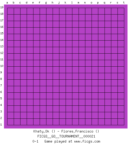 Last move : 0-1 2018 September 8 0:4:59 [Event "FICGS__GO__TOURNAMENT__000021"] [Site "FICGS"] [Date "2018.08.08"] [Round "1"] [Black "Khaty,Dk"] [White "Flores,Francisco"] [Result "0-1"] 0-1 This go game has been lost on time (started : 2018.08.08 22:53:22) Here are the names of the openings (joseki) played in the four corners : Player White won this Go (weiqi, baduk) game. Follow this game move after move (download)Don't make compact groups of stones. (Anonymous) A person who never made a mistake never tried anything new. (Albert Einstein)