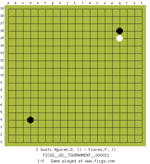 Last move : 1-0 2018 September 11 0:11:35 [Event "FICGS__GO__TOURNAMENT__000021"] [Site "FICGS"] [Date "2018.08.08"] [Round "1"] [Black "I Gusti Ngurah,Divayana"] [White "Flores,Francisco"] [Result "1-0"] 1.q16 q15 2.d4 1-0 This go game has been lost on time (started : 2018.08.08 22:53:22) Here are the names of the openings (joseki) played in the four corners : Corner q16 : q16 q15 Hoshi (Hwajeom, Seongjeom, Xingwei`) 4-4 Point. The star or hoshi (4-4) point, emphasizing influence at the potential expense of territory. Corner d4 : d4 1-0 Hoshi (Hwajeom, Seongjeom, Xingwei`) 4-4 Point. The star or hoshi (4-4) point, emphasizing influence at the potential expense of territory. Player Black won this Go (weiqi, baduk) game. Follow this game move after move (download)A knight's move near the edge of the board cannot be cut. (Bill Taylor) All war is based on deception. (Sun Tzu)