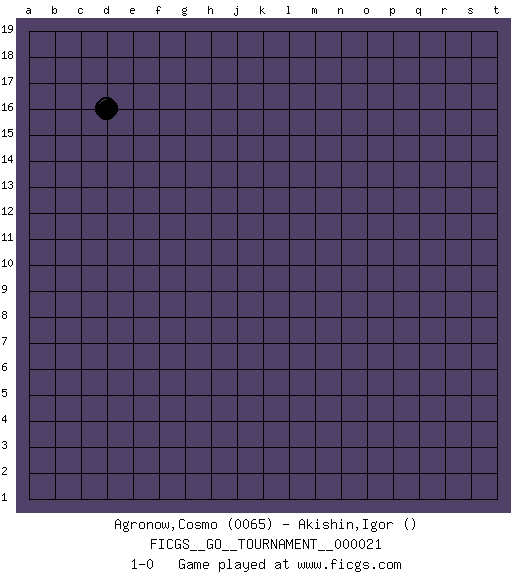 Last move : 1-0 2018 September 9 0:11:21 [Event "FICGS__GO__TOURNAMENT__000021"] [Site "FICGS"] [Date "2018.08.08"] [Round "1"] [Black "Agronow,Cosmo"] [White "Akishin,Igor"] [Result "1-0"] [Rating 1 "0065"] 1.d16 1-0 This go game has been lost on time (started : 2018.08.08 22:53:22) Here are the names of the openings (joseki) played in the four corners : Player Black won this Go (weiqi, baduk) game. Follow this game move after move (download)If you have won four corners, resign. (Anonymous) A computer lets you make more mistakes faster than any invention in human history - with the possible exceptions of handguns and tequila. (Mitch Ratcliffe)