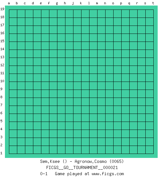 Last move : 0-1 2018 September 8 0:4:59 [Event "FICGS__GO__TOURNAMENT__000021"] [Site "FICGS"] [Date "2018.08.08"] [Round "1"] [Black "Sem,Ksee"] [White "Agronow,Cosmo"] [Result "0-1"] [Rating 2 "0065"] 0-1 This go game has been lost on time (started : 2018.08.08 22:53:22) Here are the names of the openings (joseki) played in the four corners : Player White won this Go (weiqi, baduk) game. Follow this game move after move (download)While the Baroque rules of chess could only have been created by humans, the rules of go are so elegant, organic, and rigorously logical that if intelligent life forms exist elsewhere in the universe, they almost certainly play go. (Edward Lasker, international chess master) Do not put your faith in what statistics say until you have carefully considered what they do not say. (William W. Watt)