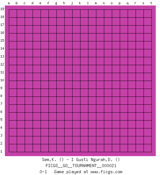 Last move : 0-1 2018 September 8 0:4:59 [Event "FICGS__GO__TOURNAMENT__000021"] [Site "FICGS"] [Date "2018.08.08"] [Round "1"] [Black "Sem,Ksee"] [White "I Gusti Ngurah,Divayana"] [Result "0-1"] 0-1 This go game has been lost on time (started : 2018.08.08 22:53:22) Here are the names of the openings (joseki) played in the four corners : Player White won this Go (weiqi, baduk) game. Follow this game move after move (download)When your opponent is thick, you must also become thick. (Otake Hideo, 9p) Home computers are being called upon to perform many new functions, including the consumption of homework formerly eaten by the dog. (Doug Larson)