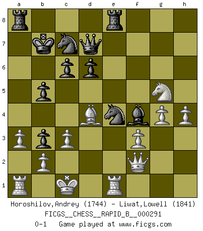 Last move : 0-1 2018 August 18 19:23:51 [Event "FICGS__CHESS__RAPID_B__000291"] [Site "FICGS"] [Date "2018.08.09"] [Round "1"] [White "Horoshilov,Andrey"] [Black "Liwat,Lowell"] [Result "0-1"] [WhiteElo "1744"] [BlackElo "1841"] 1.e4 c6 2.d4 Nf6 3.Nc3 d6 4.Nf3 h6 5.Be2 g5 6.e5 Nh7 7.h3 f6 8.exf6 Nxf6 9.Bd3 Be6 10.Qe2 Qd7 11.Bg6+ Kd8 12.Bd2 Na6 13.a3 Nc7 14.O-O-O Rg8 15.Bd3 b5 16.Ne4 a5 17.c3 Nfd5 18.Kc2 Bg7 19.Ra1 Nb6 20.Nfxg5 hxg5 21.Nxg5 Bd5 22.f3 a4 23.g4 Bb3+ 24.Kc1 e6 25.Bc2 Kc8 26.Bxb3 axb3 27.Re1 Re8 28.h4 e5 29.dxe5 Bxe5 30.Qf2 Kb7 31.Be3 Nc4 32.Bd4 Bf4+ 33.Kb1 Nd2+ 34.Kc1 Ne4 0-1 Caro-Masi defense Queenside Castling by player White (move 14) Player Black won this chess game. Follow this game move after move (download)Chess is a matter of delicate judgment, knowing when to punch and how to duck. (Bobby Fischer) Obwohl ich alt bin, darf mir niemand den Finger in den Mund stecken, sonst beisse ich. (Wilhelm Steinitz) Debemos de asegurarnos de que el Ajedrez no se convierta en un lenguaje muerto, muy interesante, pero solo para un grupo muy pequeño. (Sytze Faber) La guerre est enfant de la passion, la passion est enfant du narcissisme et le narcissisme est l'enfant. (...) Une autre partie ? (Thibault de Vassal) Lottery : A tax on people who are bad at math. (Author unknown)
