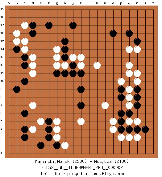 Last move : 1-0 2007 September 10 19:48:44 [Event "FICGS__GO__TOURNAMENT_PRO__000002"] [Site "FICGS"] [Date "2007.05.16"] [Round "1"] [Black "Kaminski,Marek"] [White "Mos,Ewa"] [Result "1-0"] [Rating 1 "2200"] [Rating 2 "2100"] 1.q16 d4 2.f3 p3 3.c6 e5 4.c3 g4 5.c4 d7 6.d16 c14 7.f17 b16 8.c13 d13 9.c12 d12 10.b14 c15 11.c10 d11 12.b9 c17 13.d17 b15 14.j17 r5 15.q10 r14 16.r15 q14 17.o16 q12 18.r7 r10 19.r9 r11 20.q4 q5 21.p4 q3 22.r4 r3 23.s4 o4 24.p5 o5 25.p6 g3 26.e2 n7 27.k7 k5 28.k9 q9 29.p9 q8 30.r8 p10 31.p8 q7 32.q6 q11 33.g2 h2 34.f4 g5 35.k11 k13 36.h13 h12 37.j12 j13 38.h11 g12 39.g11 g13 40.h14 g14 41.h15 k12 42.j11 m12 43.f5 1-0 This go game has been lost on time (started : 2007.05.16 16:49:44) Here are the names of the openings (joseki) played in the four corners : Corner d4 : d4 f3 Hoshi (Hwajeom, Seongjeom, Xingwei`) 4-4 Point. The star or hoshi (4-4) point, emphasizing influence at the potential expense of territory. Ikken Kakari (Hankan Keolch'im, Yi Gua`jiao~, 1-Space Low Approach). Black 2 is the standard approach move to the 4-4. Corner d16 : d16 c14 Hoshi (Hwajeom, Seongjeom, Xingwei`) 4-4 Point. The star or hoshi (4-4) point, emphasizing influence at the potential expense of territory. Ikken Kakari (Hankan Keolch'im, Yi Gua`jiao~, 1-Space Low Approach). White 2 is the standard approach move to the 4-4. Corner q16 : q16 r14 Hoshi (Hwajeom, Seongjeom, Xingwei`) 4-4 Point. The star or hoshi (4-4) point, emphasizing influence at the potential expense of territory. Ikken Kakari (Hankan Keolch'im, Yi Gua`jiao~, 1-Space Low Approach). White 2 is the standard approach move to the 4-4. Player Black won this Go (weiqi, baduk) game. Follow this game move after move (download)Territory really exists only in the end. (Pierre Audouard) Life is verb, not a noun. (Charlotte Perkins Gilman)