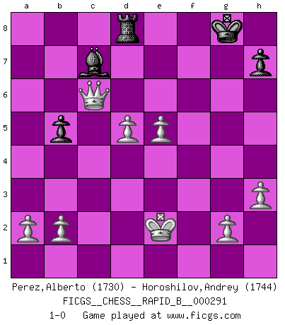 Last move : 1-0 2018 November 1 7:33:47 [Event "FICGS__CHESS__RAPID_B__000291"] [Site "FICGS"] [Date "2018.08.09"] [Round "1"] [White "Perez,Alberto"] [Black "Horoshilov,Andrey"] [Result "1-0"] [WhiteElo "1730"] [BlackElo "1744"] 1.e4 c5 2.Nf3 d6 3.Nc3 Nf6 4.d4 cxd4 5.Nxd4 Nc6 6.Nb3 e5 7.Bc4 Be7 8.O-O O-O 9.h3 Na5 10.Nxa5 Qxa5 11.Be3 Qc7 12.Qe2 a6 13.Nd5 Nxd5 14.Bxd5 Kh8 15.c4 Be6 16.f4 Bxd5 17.cxd5 exf4 18.Bxf4 f6 19.Rac1 Qd7 20.Rc3 Rg8 21.Rfc1 g5 22.Rc7 Qe8 23.Be3 Bd8 24.Bd4 b5 25.Rb7 Rg7 26.Rxg7 Kxg7 27.Qg4 Ba5 28.Qxg5 Qg6 29.Bxf6 Kf7 30.Qh4 Qxf6 31.Rf1 Qxf1+ 32.Kxf1 Kg7 33.Qe7 Kg8 34.Qxd6 Rf8+ 35.Ke2 Re8 36.e5 Rd8 37.Qxa6 Bc7 38.Qc6 1-0 Sicilian Kingside Castling by player White (move 8) Kingside Castling by player Black (move 8) Player White won this chess game. Follow this game move after move (download)Only the player with the initiative has the right to attack. (Wilhelm Steinitz) Gewöhnliche Menschen denken nur daran, wie sie ihre Zeit verbringen. Ein intelligenter Mensch versucht, sie auszunutzen. (Arthur Schopenhauer) Tu sabes que vas a perder. Aún cuando tenía la ventaja, yo sabía que iba a perder. - al estar jugando con Fischer (Andrew Soltis) Celui qui prend des risques peut perdre, celui qui n'en prend pas perd toujours. (Xavier Tartacover) Whenever people agree with me, I always feel I must be wrong. (Oscar Wilde)