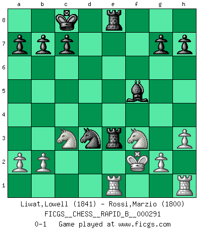 Last move : 0-1 2018 August 23 10:13:53 [Event "FICGS__CHESS__RAPID_B__000291"] [Site "FICGS"] [Date "2018.08.09"] [Round "1"] [White "Liwat,Lowell"] [Black "Rossi,Marzio"] [Result "0-1"] [WhiteElo "1841"] [BlackElo "1800"] 1.d4 d5 2.c4 e5 3.cxd5 Qxd5 4.dxe5 Qxd1 5.Kxd1 Nc6 6.f4 Bf5 7.e3 O-O-O 8.Ke1 f6 9.Nf3 fxe5 10.fxe5 Nh6 11.h3 Nf7 12.Bd2 Nfxe5 13.Bc3 Nd3 14.Bxd3 Rxd3 15.Ke2 Bc5 16.Bd2 Re8 17.Nc3 Bxe3 18.Bxe3 Rdxe3 19.Kf2 Nb4 20.Rae1 Nd3 0-1 QGD : Albin counter-gambit Queenside Castling by player Black (move 7) Player Black won this chess game. Follow this game move after move (download)When I have White, I win because I am white; When I have Black, I win because I am Bogolyubov. (Bogolyubov) Schon mancher Spieler hat aufgegeben, um zu vermeiden, daß er eine Figur verliert. (Savielly Grigorievitsch Tartakower) Sin errores no puede haber brillantez. (Emanuel Lasker) 'L'échange des dames est un coup dur pour les deux adversaires...' Un journaliste lors d'une partie du match Spassky-Fischer Think like a man of action, act like a man of thought. (Henri Louis Bergson)