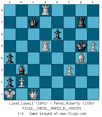 Last move : 1-0 2018 October 25 22:0:41 [Event "FICGS__CHESS__RAPID_B__000291"] [Site "FICGS"] [Date "2018.08.09"] [Round "1"] [White "Liwat,Lowell"] [Black "Perez,Alberto"] [Result "1-0"] [WhiteElo "1841"] [BlackElo "1730"] 1.d4 d5 2.c4 e6 3.f3 Nf6 4.Nc3 c6 5.e4 Be7 6.e5 Nfd7 7.f4 O-O 8.Nf3 dxc4 9.Bxc4 Nb6 10.Bd3 c5 11.dxc5 Bxc5 12.Bxh7+ Kh8 13.Qc2 Nc6 14.a3 a5 15.Ne4 Be7 16.h4 Nd4 17.Qb1 Nxf3 18.gxf3 Nc4 19.Ng5 b5 20.Bg8 g6 21.Nxf7+ Rxf7 22.Bxf7 Qf8 23.Bxg6 Bc5 24.Qe4 Rb8 25.Bh5 Bb7 26.Qg6 Bd5 27.Bg4 Rb7 28.Qd3 a4 29.Rh2 Na5 30.Be3 Rg7 31.O-O-O Nb3 32.Kb1 b4 33.Bxc5 Nxc5 34.Qe3 Bb3 35.Rd6 bxa3 36.Qxc5 a2 37.Ka1 Qxf4 38.Rhd2 Qg3 39.Qc1 Qxe5 40.Qc8+ Kh7 41.Rd8 Kg6 42.h5+ Kg5 43.Qc1 Qc7 44.R2d5+ 1-0 This chess game has been lost on time (started : 2018.08.09 14:53:36) Queen's gambit declined Kingside Castling by player Black (move 7) Queenside Castling by player White (move 31) Player White won this chess game. Follow this game move after move (download)Chess is thirty to forty percent psychology. You don't have this when you play a computer. I can't confuse it. (Judith Polgar) Du kannst im Schach nur gut werden, wenn du das Spiel liebst. (Robert James Fischer) No solamente yo pronostico su triunfo sobre Botvinnik, sino que me adelanto y digo que probablemente Fischer es el jugador de Ajedrez mas grande que haya existido. (John Collins) À la honte des hommes, on sait que les lois du jeu sont les seules qui soient partout justes, claires, inviolables et exécutées. Pourquoi l'Indien qui a donné les règles du jeu d'échecs est-il obéi de bon gré dans toute la terre, et que les décrétales des papes, par exemple, sont aujourd'hui un objet d'horreur et de mépris ? C'est que l'inventeur des échecs combina tout avec justesse pour la satisfaction des joueurs, et que les papes, dans leurs décrétales, n'eurent en vue que leur seul avantage. L'Indien voulut exercer également l'esprit des hommes et leur donner du plaisir; les papes ont voulu abrutir l'esprit des hommes. Voltaire (Dictionnaire philosophique / Garnier 1967) He who fights with monsters should be careful lest he thereby become a monster. (Friedrich Nietzsche, Beyond Good and Evil)