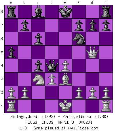 Last move : 1-0 2018 September 28 15:42:49 [Event "FICGS__CHESS__RAPID_B__000291"] [Site "FICGS"] [Date "2018.08.09"] [Round "1"] [White "Domingo,Jordi"] [Black "Perez,Alberto"] [Result "1-0"] [WhiteElo "1892"] [BlackElo "1730"] 1.e4 e5 2.Nf3 Nc6 3.Bc4 Nd4 4.Nxd4 exd4 5.c3 Qf6 6.cxd4 Qxd4 7.d3 Nf6 8.Nc3 Bb4 9.Qb3 d5 10.Qxb4 dxc4 11.Be3 a5 12.Qb5+ c6 13.Qg5 1-0 King's pawn game Player White won this chess game. Follow this game move after move (download)Fischer is under obligation to nobody. (Joseph Platz) Ein unbeabsichtigtes Patt ist der Gipfel der Dummheit. (Anonymous) Nunca nadie ha ganado una partida de Ajedrez rindiendose. (Unknown) RxDa4 pat (...) Difficult things take a long time, impossible things a little longer. (Author unknown)