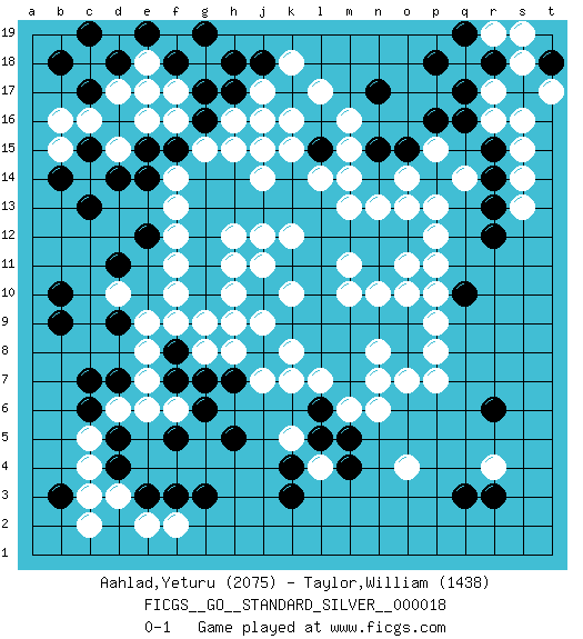 Last move : 0-1 2019 June 1 23:55:18 [Event "FICGS__GO__STANDARD_SILVER__000018"] [Site "FICGS"] [Date "2018.08.10"] [Round "1"] [Black "Aahlad,Yeturu"] [White "Taylor,William"] [Result "0-1"] [Rating 1 "2075"] [Rating 2 "1438"] 1.q16 d3 2.d16 r4 3.d5 c5 4.c6 c4 5.d7 o4 6.e3 e2 7.d4 c2 8.f3 f2 9.g3 r17 10.q17 r16 11.r15 s15 12.r14 s14 13.r13 s13 14.r12 j17 15.g17 m16 16.j15 h16 17.g14 h15 18.h14 f16 19.f15 f17 20.k17 k16 21.g16 g18 22.h18 g15 23.h17 j16 24.j18 l17 25.f18 k18 26.e15 b15 27.c15 b16 28.b14 e18 29.g19 c18 30.l15 k15 31.d18 d17 32.c17 e17 33.b18 c16 34.c19 c14 35.c13 d15 36.d14 e16 37.c15 e6 38.d16 d6 39.c7 p15 40.r18 s18 41.p18 d15 42.e19 r19 43.f5 f6 44.b3 c3 45.g6 e8 46.h5 d10 47.b10 g8 48.n15 p13 49.k14 j14 50.j13 l14 51.k13 m15 52.q19 s19 53.g7 h9 54.f8 f9 55.f7 f14 56.e14 f13 57.g12 f12 58.l13 m14 59.g11 f11 60.g10 g9 61.j10 j9 62.k9 k8 63.l8 k7 64.m9 e7 65.b9 k10 66.l9 j11 67.g13 h10 68.l11 k5 69.h7 j7 70.k3 p11 71.o12 p12 72.q10 p10 73.p14 o14 74.l6 l7 75.m7 m6 76.l5 l4 77.m5 n6 78.k4 n7 79.m8 f10 80.k11 j12 81.j8 h8 82.o9 p9 83.o8 p7 84.m4 n8 85.n9 p8 86.d9 e9 87.n11 o10 88.d11 n10 89.o15 q14 90.s17 s16 91.r6 o7 92.l10 m13 93.e12 m11 94.m12 m10 95.j15 n13 96.n12 j14 97.t18 t17 98.r3 j15 99.h13 h11 100.l12 o11 101.q3 o13 102.p16 h12 103.n17 k12 0-1 Here are the names of the openings (joseki) played in the four corners : Corner d4 : d3 d5 Komoku (Somok, Xiao~mu`) 3-4 Point. The komoku (3-4) point is the traditional corner enclosure move.. Ikken Takagakari (Hankan Nop'dakeolch'im, Yi Gaogua`jiao~, 1-Space High Approach). The 5-4 approach move has become more popular in modern times, as modern Go emphasizes speed and influence. Corner q16 : q16 r17 Hoshi (Hwajeom, Seongjeom, Xingwei`) 4-4 Point. The star or hoshi (4-4) point, emphasizing influence at the potential expense of territory. Corner d16 : d16 j17 Hoshi (Hwajeom, Seongjeom, Xingwei`) 4-4 Point. The star or hoshi (4-4) point, emphasizing influence at the potential expense of territory. Player White won this Go (weiqi, baduk) game. Follow this game move after move (download)Against three in a row, play right in the center. (Anonymous) Real knowledge is to know the extent of one's ignorance. (Confucius)