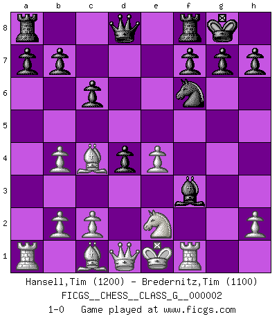 Last move : 1-0 2006 September 3 18:39:13 [Event "FICGS__CHESS__CLASS_G__000002"] [Site "FICGS"] [Date "2006.06.07"] [Round "1"] [White "Hansell,Tim"] [Black "Bredernitz,Tim"] [Result "1-0"] [WhiteElo "1200"] [BlackElo "1100"] 1.Nc3 e5 2.Nf3 Nc6 3.e4 Bb4 4.a3 Nd4 5.axb4 Nxf3+ 6.gxf3 c6 7.Bc4 Nf6 8.f4 d6 9.fxe5 dxe5 10.d4 exd4 11.Ne2 Bg4 12.Rg1 O-O 13.f3 Bxf3 14.Rf1 1-0 Dunst (Sleipner-Heinrichsen) Opening Kingside Castling by player Black (move 12) Player White won this chess game. Follow this game move after move (download)Becoming successful at Chess allows you to discover your own personality. That's what I want for the kids I teach. (Saudin Robovic) Die unerbitterlichsten Regeln im Schach sind die Ausnahmen. (Savielly Grigorievitsch Tartakower) Si tu oponente no puede hacer nada activo, entonces no apures la posición; En vez de eso, dejalo estar sentado ahí, sufriendo y rogandote por un empate. (Jeremy Silman) Même si l'adversaire joue le coup analysé précédemment, recommencez l'analyse en voyant la nouvelle position. Première règle de Blumenfeld Some people are so afraid to die that they never begin to live. (Henry Van Dyke)