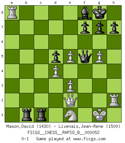 Last move : 0-1 2007 June 26 22:10:40 [Event "FICGS__CHESS__RAPID_B__000052"] [Site "FICGS"] [Date "2007.05.17"] [Round "1"] [White "Mason,David"] [Black "Livenais,Jean-Rene"] [Result "0-1"] [WhiteElo "1430"] [BlackElo "1500"] 1.e4 e6 2.d4 d5 3.e5 c5 4.Bb5+ Bd7 5.Bxd7+ Qxd7 6.c3 Nc6 7.Nf3 cxd4 8.cxd4 Nge7 9.O-O Nf5 10.Nc3 Be7 11.h3 Rc8 12.a3 O-O 13.Be3 Na5 14.g4 Nxe3 15.fxe3 Nc4 16.Qe2 b5 17.g5 Nxa3 18.Nxd5 exd5 19.bxa3 Qxh3 20.Rf2 a6 21.Rg2 Rc3 22.Rh2 Qf5 23.a4 bxa4 24.Rxa4 Rc1+ 25.Ne1 Rb8 26.Rxa6 R8b1 27.Ra8+ Bf8 0-1 French : Advance variation Kingside Castling by player White (move 9) Kingside Castling by player Black (move 12) Player Black won this chess game. Follow this game move after move (download)A Chess game is divided into three stages: the first, when you hope you have the advantage, the second when you believe you have an advantage, and the third... when you know you're going to lose ! (Savielly Tartakower) Im Schach gewinnt jeder. Hat man Freunde am Spiel - und das ist die Hauptsache - ist auch der Verlust einer Partie kein Unglück. (David Bronstein) Morphy probablemente fue el genio más grande de todos. (Bobby Fischer) La guerre est enfant de la passion, la passion est enfant du narcissisme et le narcissisme est l'enfant. (...) Une autre partie ? (Thibault de Vassal) Industry executives and analysts often mistakenly talk about strategy as if it were some kind of chess match. But in chess, you have just two opponents, each with identical resources, and with luck playing a minimal role. The real world is much more like a poker game, with multiple players trying to make the best of whatever hand fortune has dealt them. In our industry, Bill Gates owns the table until someone proves otherwise. (David Moschella, 'Computerworld')