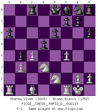 Last move : 0-1 2018 November 6 22:1:47 [Event "FICGS__CHESS__RAPID_D__000117"] [Site "FICGS"] [Date "2018.08.12"] [Round "1"] [White "Sharma,Vivek"] [Black "Bromo,Alexis"] [Result "0-1"] [WhiteElo "1609"] [BlackElo "1352"] 1.e4 c5 2.f4 d6 3.Nf3 Nc6 4.Nc3 h6 5.Bb5 Bd7 6.O-O a6 7.Bc4 b5 8.Bd5 e6 9.Bxc6 Bxc6 10.a3 b4 11.Ne2 Bxe4 12.c4 d5 13.d3 Bf5 14.Qa4+ Qd7 15.Qxd7+ Kxd7 16.b3 Bxd3 17.Ne5+ Ke8 18.Nxd3 Rc8 19.axb4 cxb4 0-1 This chess game has been lost on time (started : 2018.08.12 2:42:14) Sicilian : Grand Prix attack Kingside Castling by player White (move 6) Player Black won this chess game. Follow this game move after move (download)The passion for playing Chess is one of the most unaccountable in the world. (H.G. Wells) Ein Gewinn durch eine ungenaue Kombination, sei sie auch noch so vorzeigbar, erfüllt mich mit Schaudern. (Wilhelm Steinitz) Yo considero que Fischer es uno de los expertos mas grandes de aperturas de siempre. (Keith Hayward) Les Echecs ont trois composantes : le temps, l'espace et le matériel en dernier. (Mikhail Tal) It is a good thing for an uneducated man to read books of quotations. (Winston Churchill)