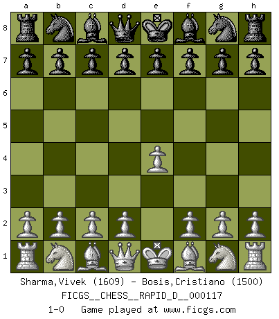Last move : 1-0 2018 September 11 12:19:10 [Event "FICGS__CHESS__RAPID_D__000117"] [Site "FICGS"] [Date "2018.08.12"] [Round "1"] [White "Sharma,Vivek"] [Black "Bosis,Cristiano"] [Result "1-0"] [WhiteElo "1609"] [BlackElo "1500"] 1.e4 1-0 This chess game has been lost on time (started : 2018.08.12 2:42:14) King's pawn Opening Player White won this chess game. Follow this game move after move (download)The battle for the ultimate truth will never be won. And that's why Chess is so fascinating. (Hans Kmoch) Ich würde die 30 stärksten Spieler der USA im Simultanspiel besiegen. (José Raúl Capablanca) En posiciones complicadas, Bobby Fischer pocas veces tuvo que temer de cualquiera. (Paul Keres) Ce qui est bien, c'est d'avoir tout un tas de pièces en prise : l'adversaire ne peut en prendre qu'une à la fois. Cité par Thierry Audin. The real danger is not that computers will begin to think like men, but that men will begin to think like computers. (Sydney J. Harris)