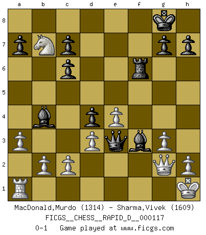 Last move : 0-1 2018 August 25 9:47:52 [Event "FICGS__CHESS__RAPID_D__000117"] [Site "FICGS"] [Date "2018.08.12"] [Round "1"] [White "MacDonald,Murdo"] [Black "Sharma,Vivek"] [Result "0-1"] [WhiteElo "1314"] [BlackElo "1609"] 1.e4 e5 2.Nf3 d5 3.Nc3 d4 4.Nd5 Nc6 5.Bb5 Nf6 6.d3 Bd7 7.O-O Bc5 8.Bxc6 bxc6 9.Nxf6+ Qxf6 10.Bg5 Qg6 11.Nxe5 Qxg5 12.Nc4 O-O 13.Na5 f5 14.f3 fxe4 15.fxe4 Bh3 16.Qe2 Rf6 17.g3 Raf8 18.Rxf6 Rxf6 19.Nb7 Bb4 20.a3 Bg4 21.Qg2 Qe3+ 22.Kh1 Bf3 0-1 QP counter-gambit (elephant gambit) Kingside Castling by player White (move 7) Kingside Castling by player Black (move 12) Player Black won this chess game. Follow this game move after move (download)Chess books should be used as we use glasses: to assist the sight, although some players make use of them as if they thought they conferred sight. (Jose Raul Capablanca) Schach ist Leben. (Robert James Fischer) Debemos de asegurarnos de que el Ajedrez no se convierta en un lenguaje muerto, muy interesante, pero tan solo para un grupo muy pequeño. (Sytze Faber) Vouloir jouer aux échecs contre soi-même est aussi paradoxal que vouloir marcher sur son ombre. (Stefan Zweig) May I never be complete. May I never be content. May I never be perfect. Deliver me, Tyler, from being perfect and complete. (Chuck Palahniuk, Fight Club)