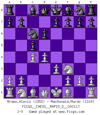 Last move : 1-0 2018 August 31 22:55:19 [Event "FICGS__CHESS__RAPID_D__000117"] [Site "FICGS"] [Date "2018.08.12"] [Round "1"] [White "Bromo,Alexis"] [Black "MacDonald,Murdo"] [Result "1-0"] [WhiteElo "1352"] [BlackElo "1314"] 1.d4 d6 2.c4 c5 3.e3 Nc6 4.Nf3 1-0 Old Indian defense Player White won this chess game. Follow this game move after move (download)In order to improve your game, you must study the endgame before everything else, for whereas the endings can be studied and mastered by themselves, the middle game and the opening must be studied in relation to the endgame. (Jose Raul Capablanca) Ohne Fehler kann es keine Brillanz geben. (Emanuel Lasker) Después de una mala apertura, hay una esperanza en el juego medio. Pero una vez que estas en finales, el momento de la verdad ha llegado. (Edmar Mednis) Des combinaisons [dans le jeu d'échecs] pareilles à des mélodies. Je crois entendre pour ainsi dire la musique des coups... (Vladimir Nabokov) Hold em is to stud what chess is to checkers. (Johnny Moss)