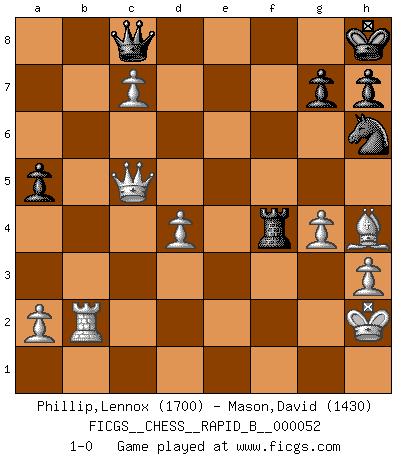Last move : 1-0 2007 June 4 16:28:13 [Event "FICGS__CHESS__RAPID_B__000052"] [Site "FICGS"] [Date "2007.05.17"] [Round "1"] [White "Phillip,Lennox"] [Black "Mason,David"] [Result "1-0"] [WhiteElo "1700"] [BlackElo "1430"] 1.d4 Nf6 2.c4 e6 3.Nf3 d5 4.e3 Bb4+ 5.Bd2 Bd6 6.c5 Be7 7.Nc3 O-O 8.Ne5 c6 9.Bd3 Qc7 10.O-O Bxc5 11.Nxf7 Qxf7 12.dxc5 e5 13.h3 e4 14.Be2 Qg6 15.Kh2 Nbd7 16.b4 Ne5 17.f4 Nf7 18.Be1 Nh6 19.Bh4 Ne8 20.Bh5 Qe6 21.Bxe8 Qxe8 22.g4 b6 23.Qd4 bxc5 24.Qxc5 Qd7 25.Rg1 a5 26.b5 d4 27.bxc6 Qa7 28.Qd5+ Kh8 29.exd4 Ba6 30.Nxe4 Rae8 31.Nd6 Rb8 32.Rab1 Rxf4 33.Qc5 Qc7 34.Rxb8+ Qxb8 35.c7 Qf8 36.Rg2 Bc8 37.Nxc8 Qxc8 38.Rb2 1-0 Queen's pawn game Kingside Castling by player Black (move 7) Kingside Castling by player White (move 10) Player White won this chess game. Follow this game move after move (download)Good offense and good defense both begin with good development. (Bruce A. Moon) Ich könnte leicht behaupten: Ja,ja, Leonid Breschnew wollte nicht, daß ich Weltmeister werde. In der Tat war die Sache komplizierter. (Viktor Kortschnoi) Debemos de asegurarnos de que el Ajedrez no se convierta en un lenguaje muerto, muy interesante, pero tan solo para un grupo muy pequeño. (Sytze Faber) La vie et les Echecs sont tous les deux une lutte constante. (Lasker) The Internet is the world's largest library. It's just that all the books are on the floor. (John Allen Paulos)
