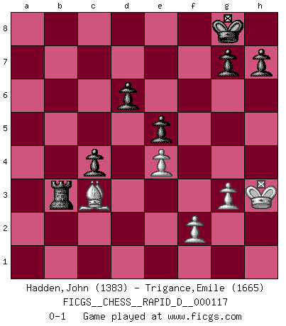 Last move : 0-1 2018 August 22 17:48:28 [Event "FICGS__CHESS__RAPID_D__000117"] [Site "FICGS"] [Date "2018.08.12"] [Round "1"] [White "Hadden,John"] [Black "Trigance,Emile"] [Result "0-1"] [WhiteElo "1383"] [BlackElo "1665"] 1.d4 Nf6 2.c4 e6 3.Nf3 b6 4.Nc3 Bb7 5.e3 Bb4 6.Bd2 O-O 7.Bd3 d6 8.a3 Bxc3 9.Bxc3 Ne4 10.Bxe4 Bxe4 11.O-O f5 12.d5 Bxf3 13.Qxf3 e5 14.b4 Qh4 15.Rad1 Qxc4 16.Bb2 Qg4 17.Qxg4 fxg4 18.Rc1 Rc8 19.e4 a5 20.Rc6 Nxc6 21.dxc6 axb4 22.axb4 Ra2 23.Bc3 Rc2 24.Be1 Rxc6 25.Bd2 Rc2 26.Be3 Rb2 27.Rc1 Ra8 28.g3 c5 29.bxc5 bxc5 30.Rd1 Ra6 31.Kg2 c4 32.Rc1 Rc6 33.Rc3 Rb3 34.Bd2 Rxc3 35.Bxc3 Rb6 36.h3 gxh3+ 37.Kxh3 Rb3 0-1 Queen's Indian : 4.Nc3 Kingside Castling by player Black (move 6) Kingside Castling by player White (move 11) Player Black won this chess game. Follow this game move after move (download)Bobby is the finest Chess player this country ever produced. His memory for the moves, his brilliance in dreaming up combinations, and his fierce determination to win are uncanny. (John Collins) Schach wird sich dank seiner hohen kulturellen Tradition immer durchsetzen. In näherer Zukunft womöglich sogar als Gegenreaktion auf die maßlose Reizüberflutung im Freizeit- und Spielbereich. (Garry Kasparov) Tu puedes aprender mucho mas de una partida que pierdas que de una partida ganada. Tendras que perder cientos de partidas antes de llegar a ser un buen jugador. (Jose Raul Capablanca) Les erreurs sont comme les malheurs, elles n'arrivent jamais seules. (Siegbert Tarrasch) Methinks King Thibault should dub Marius Zubac a knight of the square board... I mean table, henceforth addressing him as Sir Marius, and bestow on him a suitable land from the kingdom of FICGS & marry him off to a worthy, fair maiden, lest he slice our heads with his mighty sword in his wrath. (Dinesh De Silva)