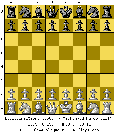 Last move : 0-1 2018 September 11 12:19:10 [Event "FICGS__CHESS__RAPID_D__000117"] [Site "FICGS"] [Date "2018.08.12"] [Round "1"] [White "Bosis,Cristiano"] [Black "MacDonald,Murdo"] [Result "0-1"] [WhiteElo "1500"] [BlackElo "1314"] 0-1 This chess game has been lost on time (started : 2018.08.12 2:42:14) Player Black won this chess game. Follow this game move after move (download)Chess is mental torture. (Garry Kasparov) Mein Name ist Rustam Kamsky. Sie haben meinen Sohn belästigt. Bereiten Sie sich aufs Sterben vor. (Rustam Kamsky) Yo considero que Fischer es uno de los expertos mas grandes de aperturas de siempre. (Keith Hayward) Demandez au pauvre Cg1 ce qu'il en pense. Eduard Gufeld à propos de la variante Saemisch de l'Est-Indienne. Chess is as much a mystery as women. (Purdy)