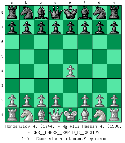 Last move : 1-0 2018 September 11 12:19:10 [Event "FICGS__CHESS__RAPID_C__000179"] [Site "FICGS"] [Date "2018.08.12"] [Round "1"] [White "Horoshilov,Andrey"] [Black "Ag Alli Hassan,Ag Rachmat"] [Result "1-0"] [WhiteElo "1744"] [BlackElo "1500"] 1.e4 1-0 This chess game has been lost on time (started : 2018.08.12 2:42:31) King's pawn Opening Player White won this chess game. Follow this game move after move (download)Castle early and often. (Rob Sillars) Frage: Was machen Sie mit den Preisen? Anwort: Ich habe Angst, dass meine Freundin davon neue Kleider kauft. (Loek van Wely) Después de una mala apertura, hay una esperanza en el juego medio. Pero una vez que estas en finales, el momento de la verdad ha llegado. (Edmar Mednis) 'L'échange des dames est un coup dur pour les deux adversaires...' Un journaliste lors d'une partie du match Spassky-Fischer I fear not the man who has practiced 10,000 kicks once, but I fear the man who has practiced one kick 10,000 times. (Bruce Lee)