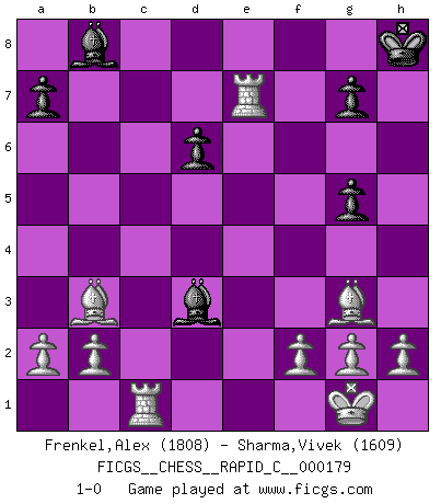 Last move : 1-0 2018 August 19 3:21:3 [Event "FICGS__CHESS__RAPID_C__000179"] [Site "FICGS"] [Date "2018.08.12"] [Round "1"] [White "Frenkel,Alex"] [Black "Sharma,Vivek"] [Result "1-0"] [WhiteElo "1808"] [BlackElo "1609"] 1.e4 e5 2.Nf3 Nc6 3.Bb5 Nf6 4.O-O Bc5 5.c3 O-O 6.d4 exd4 7.cxd4 Bb6 8.d5 Ne7 9.Nc3 c6 10.Ba4 d6 11.Bg5 Ng6 12.dxc6 bxc6 13.Bxc6 Rb8 14.Nd5 h6 15.Nxf6+ Kh8 16.Nd7 Qc7 17.Nxb8 Qxb8 18.Bc1 Bg4 19.Bd5 Ne5 20.Bf4 Ng6 21.Bg3 Bc7 22.Qb3 f5 23.exf5 Rxf5 24.Rac1 Ne7 25.Qxb8+ Bxb8 26.Be6 Rg5 27.Nxg5 Be2 28.Rfe1 Bd3 29.Bb3 hxg5 30.Rxe7 1-0 Ruy Lopez : Berlin defense, Beverwijk variation Kingside Castling by player White (move 4) Kingside Castling by player Black (move 5) Player White won this chess game. Follow this game move after move (download)Chess is 99 percent tactics. (Teichmann) Nie in meinem Leben habe ich die französische Verteidigung gespielt, welche die Stumpfsinnigste von allen ist. (Wilhelm Steinitz) Cualquier cambio de material en una posición debe venir por medio de un mate, una captura o promoción de Peón. (Purdy) Avec des compensations pour le matériel en plus... (Anonyme) A bird doesn't sing because it has an answer, it sings because it has a song. (Maya Angelou)