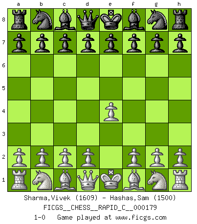 Last move : 1-0 2018 September 11 12:19:10 [Event "FICGS__CHESS__RAPID_C__000179"] [Site "FICGS"] [Date "2018.08.12"] [Round "1"] [White "Sharma,Vivek"] [Black "Hashas,Sam"] [Result "1-0"] [WhiteElo "1609"] [BlackElo "1500"] 1.e4 1-0 This chess game has been lost on time (started : 2018.08.12 2:42:31) King's pawn Opening Player White won this chess game. Follow this game move after move (download)I look one move ahead... the best ! (Siegbert Tarrasch) Ich rechne überhaupt nicht voraus. Ich gewinne auch so. (Robert James Fischer) Muchos jugadores de Ajedrez se sorprendían cuando después de la partida, Fischer explicaba con calma: 'Yo ya había analizado esta posibilidad' en una posición en la cual yo creía que no era posible de prever desde la apertura. (Mikhail Tal) Roi des jeux et jeu des rois, les échecs portent en eux un sentiment d'infini. Ils donnent à celui qui s'est efforcé d'en approfondir les arcanes l'impression de n'être pas à la mesure de l'homme; en fait, ils constituent un résumé de l'univers, un microcosme, et figurent cette grande échelle qui, dans les plans de la lumière descend jusqu'à la matière, qui des abîmes insondables remonte jusqu'en l'infini de Dieu. (Pyrame) There are three kinds of lies: lies, damned lies and statistics. (Mark Twain)