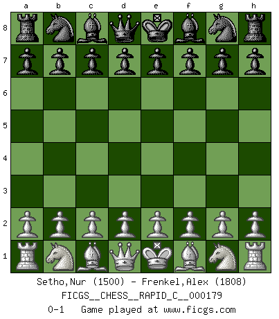 Last move : 0-1 2018 September 11 12:19:10 [Event "FICGS__CHESS__RAPID_C__000179"] [Site "FICGS"] [Date "2018.08.12"] [Round "1"] [White "Setho,Nur"] [Black "Frenkel,Alex"] [Result "0-1"] [WhiteElo "1500"] [BlackElo "1808"] 0-1 This chess game has been lost on time (started : 2018.08.12 2:42:31) Player Black won this chess game. Follow this game move after move (download)Don't even mention losing to me. I can't stand to think of it. (Bobby Fischer) Auf jeden Fall musst du zuerst Rechtsanwalt werden, damit du deine eigenen Interessen und die deiner Familie vertreten kannst. [Brief an seinen Sohn] (José Raúl Capablanca) Si no le temes a Spassky, entonces elimino el elemento del dinero. (Jim Slater) Les Echecs représentent une sphère d'idées créatrices basée sur la volonté des deux protagonistes. (Smyslov) Fortune favours the audacious. (Desiderius Erasmus)