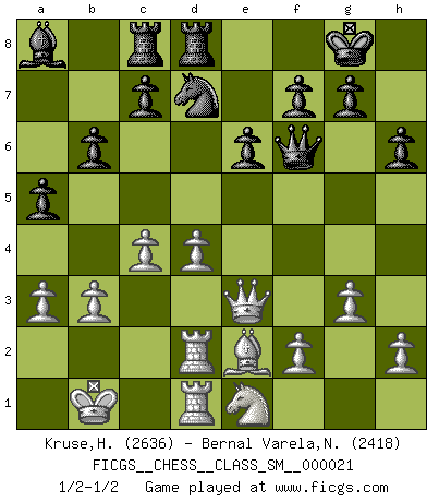 Last move : 1/2-1/2 2018 September 30 18:44:34 [Event "FICGS__CHESS__CLASS_SM__000021"] [Site "FICGS"] [Date "2018.08.12"] [Round "1"] [White "Kruse,Herbert"] [Black "Bernal Varela,Nelson"] [Result "1/2-1/2"] [WhiteElo "2636"] [BlackElo "2418"] 1.e4 e6 2.d4 d5 3.Nc3 Nf6 4.Bg5 dxe4 5.Nxe4 Be7 6.Nxf6+ Bxf6 7.Bxf6 Qxf6 8.Nf3 O-O 9.Qd3 Rd8 10.O-O-O Bd7 11.Rd2 a5 12.c3 Ba4 13.Qe3 Nd7 14.Be2 Bc6 15.c4 h6 16.Rhd1 Rac8 17.Kb1 b6 18.g3 Ba4 19.b3 Bc6 20.Ne1 Ba8 21.a3 1/2-1/2 French : Burn variation Kingside Castling by player Black (move 8) Queenside Castling by player White (move 10) This chess game ended in a draw. Follow this game move after move (download)It was clear to me that the vulnerable point of the American Grandmaster (Bobby Fischer) was in double-edged, hanging, irrational positions, where he often failed to find a win even in a won position. (Efim Geller) Der Umstand, daß uns eine 7 Stunden Zeitkontrolle ermöglicht eine großartige, tiefe Partie zu spielen, ist für die Massenmedien nicht weiter von Bedeutung. (Alexej Shirov) Después de la respuesta de las negras a 1.e4 con 1..e5, se quedan siempre tratando de entrar dentro del juego. (Howard Staunton) Il vaut toujours mieux jouer un plan faux de façon logique que de n'avoir pas de plan du tout. (Victor Kortchnoï) Imagination is more important than knowledge. Knowledge is limited. Imagination encircles the world. (Albert Einstein)