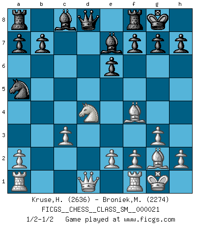Last move : 1/2-1/2 2018 September 30 7:54:50 [Event "FICGS__CHESS__CLASS_SM__000021"] [Site "FICGS"] [Date "2018.08.12"] [Round "1"] [White "Kruse,Herbert"] [Black "Broniek,Mariusz Maciej"] [Result "1/2-1/2"] [WhiteElo "2636"] [BlackElo "2274"] 1.Nf3 d5 2.g3 Nf6 3.Bg2 e6 4.O-O Be7 5.d3 c5 6.c4 O-O 7.cxd5 Nxd5 8.d4 cxd4 9.Nxd4 Nc6 10.Nc3 Nxc3 11.bxc3 Na5 12.Bf4 1/2-1/2 Reti : King's Indian attack (Barcza system) Kingside Castling by player White (move 4) Kingside Castling by player Black (move 6) This chess game ended in a draw. Follow this game move after move (download)No one ever won a game by resigning. (Unknown) Die FIDE ist dabei in die Hände der russischen Mafia zu fallen. (Larry Evans) El Ajedrez es un terrible juego. Si no controlas el centro, tu oponente tiene una posición mas holgada. Si tienes control del centro, ¡entonces realmente tu tienes algo de que preocuparte!. (Siegbert Tarrasch) Les Echecs ne sont pas pour les âmes timides. Ils requièrent un homme entier, qui ne s'arrête pas aveuglément à ce qui a été déjà établi, mais qui tente individuellement de sonder les profondeurs du jeu. (W. Steinitz) I believe in luck. How else can you explain the success of those you dislike ? (Jean Cocteau)