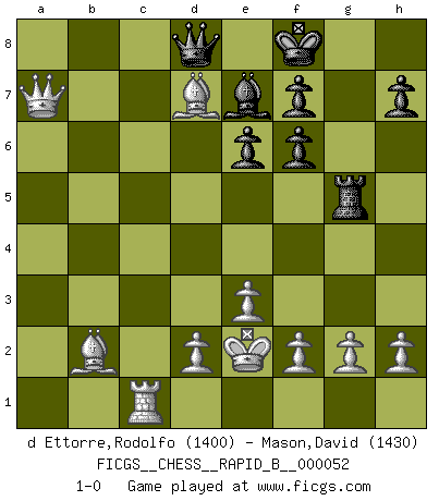 Last move : 1-0 2007 June 3 16:18:41 [Event "FICGS__CHESS__RAPID_B__000052"] [Site "FICGS"] [Date "2007.05.17"] [Round "1"] [White "d Ettorre,Rodolfo"] [Black "Mason,David"] [Result "1-0"] [WhiteElo "1400"] [BlackElo "1430"] 1.Nf3 d5 2.c4 dxc4 3.e3 b5 4.a4 c6 5.axb5 cxb5 6.Nd4 Qb6 7.Nc3 Bd7 8.Qf3 Bc6 9.Nxc6 Nxc6 10.b3 Rc8 11.bxc4 bxc4 12.Bxc4 e6 13.Ra6 Ne5 14.Qe4 Qc7 15.Bb5+ Nd7 16.Qa4 Bc5 17.Rc6 Qd8 18.Ne4 Rxc6 19.Bxc6 Be7 20.Bb2 Ngf6 21.Nxf6+ gxf6 22.Qxa7 Rg8 23.Ke2 Rg5 24.Rc1 Kf8 25.Bxd7 1-0 Reti accepted Player White won this chess game. Follow this game move after move (download)Chess is a cold bath for the mind. (Sir John Simon) Rubinstein ist ein Turmendspiel, welches die Götter vor tausenden von Jahren begannen. (Savielly Grigorievitsch Tartakower) Sin errores no puede haber brillantez. (Emanuel Lasker) Il vaut toujours mieux jouer un plan faux de façon logique que de n'avoir pas de plan du tout. (Victor Kortchnoï) The real danger is not that computers will begin to think like men, but that men will begin to think like computers. (Sydney J. Harris)