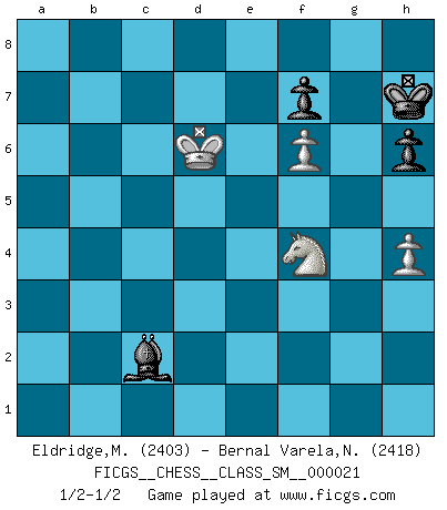 Last move : 1/2-1/2 2019 April 25 1:14:27 [Event "FICGS__CHESS__CLASS_SM__000021"] [Site "FICGS"] [Date "2018.08.12"] [Round "1"] [White "Eldridge,Mark"] [Black "Bernal Varela,Nelson"] [Result "1/2-1/2"] [WhiteElo "2403"] [BlackElo "2418"] 1.d4 e6 2.e4 d5 3.Nc3 Nf6 4.e5 Nfd7 5.f4 c5 6.Nf3 cxd4 7.Nxd4 Nc6 8.Be3 Qb6 9.Na4 Qc7 10.Qd2 Be7 11.Nc3 O-O 12.Ncb5 Qd8 13.Nc3 Nb6 14.O-O-O Na5 15.b3 Bb4 16.Kb1 Nc6 17.Kb2 Qe7 18.Ndb5 a6 19.a3 Na4+ 20.bxa4 axb5 21.axb4 Qxb4+ 22.Ka2 d4 23.Bxd4 Rd8 24.Bxb5 Nxd4 25.Qd3 b6 26.Qc4 Qxc4+ 27.Bxc4 Bb7 28.Kb2 Bxg2 29.Rhg1 Bf3 30.Rd2 Nc6 31.Rxd8+ Rxd8 32.Rf1 Bg2 33.Rf2 Bh1 34.Bd3 h6 35.Rf1 Bg2 36.Rg1 Bf3 37.Rg3 Nd4 38.Nb5 Bc6 39.Kc3 Nf5 40.Bxf5 exf5 41.Nd6 Bxa4 42.Nxf5 Kf8 43.Nxg7 Rc8+ 44.Kb4 Bxc2 45.f5 Rc5 46.f6 Rxe5 47.Rc3 Rc5 48.Rxc5 bxc5+ 49.Kxc5 Bg6 50.Kd4 Kg8 51.Ke5 Kf8 52.h3 Kg8 53.Kd6 Kf8 54.Ke5 Kg8 55.Kd6 Kf8 56.Kd5 Kg8 57.Ke5 Bc2 58.h4 Kh7 59.Nh5 Bb1 60.Nf4 Bc2 61.Kd6 1/2-1/2 Queen's pawn Kingside Castling by player Black (move 11) Queenside Castling by player White (move 14) 10 pieces endgame at move 48 : White KRNPP , Black KBPPP WHITE : King + 1 Rook 1 Knight 2 Pawns BLACK : King + 1 Bishop 3 Pawns 9 pieces endgame at move 48 : White KNPP , Black KBPPP WHITE : King + 1 Knight 2 Pawns BLACK : King + 1 Bishop 3 Pawns 8 pieces endgame at move 49 : White KNPP , Black KBPP WHITE : King + 1 Knight 2 Pawns BLACK : King + 1 Bishop 2 Pawns This chess game ended in a draw. Follow this game move after move (download)Is Bobby Fischer quite sane ? (Salo Flohr) Immer nach dem besten Zug zu suchen ist ziemlich unpraktisch. (Nigel Short) Yo nunca en mi vida he jugado la Defensa Francesa, que viene siendo la más aburrida de todas las Aperturas. (Wilhelm Steinitz) Fischer est le meilleur joueur du monde et Karpov n'est qu'un joueur de bistrot. (Garry Kasparov, agé de 16 ans) Are you threatening me, Master Jedi ? (Chancellor Palpatine in Star Wars ep.3)