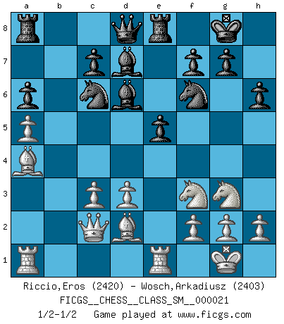 Last move : 1/2-1/2 2018 October 19 22:33:41 [Event "FICGS__CHESS__CLASS_SM__000021"] [Site "FICGS"] [Date "2018.08.12"] [Round "1"] [White "Riccio,Eros"] [Black "Wosch,Arkadiusz"] [Result "1/2-1/2"] [WhiteElo "2420"] [BlackElo "2403"] 1.e4 e5 2.Nf3 Nc6 3.Bb5 a6 4.Ba4 Nf6 5.d3 b5 6.Bb3 Be7 7.O-O d6 8.c3 O-O 9.a4 Bd7 10.Bc2 Re8 11.Re1 h6 12.Nbd2 Bf8 13.Nf1 b4 14.a5 d5 15.exd5 Nxd5 16.Bd2 Bd6 17.Bb3 bxc3 18.bxc3 Be6 19.Ng3 Nf6 20.Ba4 Bd7 21.Qc2 1/2-1/2 Ruy Lopez : Anderssen variation Kingside Castling by player White (move 7) Kingside Castling by player Black (move 8) This chess game ended in a draw. Follow this game move after move (download)I have added these principles to the law: get the Knights into action before both Bishops are developed. (Emanuel Lasker) Die Leute spielen gegen mich seit 15 Jahren unter Ihren Möglichkeiten. (Robert James Fischer) En el tablero, la mentira e hipocresía no sobreviven mucho. (Emanuel Lasker) Vous m'avez demandé de vous exposer quel est le fondement de la prière. Je ne fais que préparer les pièces du jeu sur la table... Nous sera-t-il permis d'en adopter les règles et si nous les appliquons scrupuleusement nous ne tarderons pas à faire mat le Roi divin ! Il ne pourra échapper à nos mains. (Sainte Thérèse d'Avila, Chemin de perfection) Coffee just isn't my cup of tea. (Unknown)