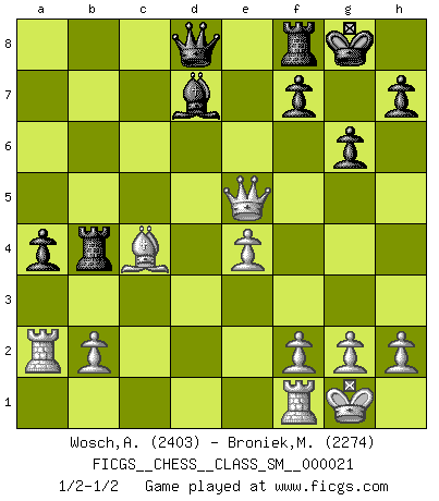 Last move : 1/2-1/2 2018 October 24 18:22:12 [Event "FICGS__CHESS__CLASS_SM__000021"] [Site "FICGS"] [Date "2018.08.12"] [Round "1"] [White "Wosch,Arkadiusz"] [Black "Broniek,Mariusz Maciej"] [Result "1/2-1/2"] [WhiteElo "2403"] [BlackElo "2274"] 1.e4 c5 2.Nf3 Nc6 3.d4 cxd4 4.Nxd4 Nf6 5.Nc3 e5 6.Ndb5 d6 7.Bg5 a6 8.Na3 b5 9.Nd5 Be7 10.Bxf6 Bxf6 11.c3 O-O 12.Nc2 Bg5 13.a4 bxa4 14.Rxa4 a5 15.Bc4 Bd7 16.Nce3 Ne7 17.Ra2 Nxd5 18.Nxd5 a4 19.O-O Rb8 20.Nb4 g6 21.Qxd6 Be7 22.Qxe5 Bxb4 23.cxb4 Rxb4 1/2-1/2 Sicilian : Pelikan (Lasker/Sveshnikov) variation Kingside Castling by player Black (move 11) Kingside Castling by player White (move 19) This chess game ended in a draw. Follow this game move after move (download)There just isn't enough televised Chess. (David Letterman) Im Wettkampf zwischen starken Meistern kommen Fehler sehr selten vor, deshalb ist es mit bloßem Warten nicht getan. (José Raúl Capablanca) El juego de Damas es para vagabundos. (Paul Morphy) Des points faibles ou des trous dans la position de l'adversaire doivent être occupés par des pièces et non pas par des pions. (Siegbert Tarrasch) Cactus - It is depressed cucumber. (Ilmars Cirulis)