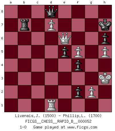 Last move : 1-0 2007 November 17 15:31:6 [Event "FICGS__CHESS__RAPID_B__000052"] [Site "FICGS"] [Date "2007.05.17"] [Round "1"] [White "Livenais,Jean-Rene"] [Black "Phillip,Lennox"] [Result "1-0"] [WhiteElo "1500"] [BlackElo "1700"] 1.e4 e5 2.Nf3 Nc6 3.Bb5 a6 4.Ba4 Nf6 5.O-O Be7 6.Re1 b5 7.Bb3 d6 8.c3 Na5 9.Bc2 c5 10.d4 Qc7 11.h3 O-O 12.Nbd2 Re8 13.Nf1 Bf8 14.Bg5 Nd7 15.Ne3 Nb6 16.b3 h6 17.Bh4 Nc6 18.Rc1 Ne7 19.Bg3 Ng6 20.Qd2 Bb7 21.Nf5 c4 22.h4 cxb3 23.axb3 Rac8 24.Bd3 Ne7 25.Ne3 Ng6 26.h5 Nf4 27.Bxf4 exf4 28.Nf5 g6 29.N5h4 g5 30.Nf5 Nd7 31.d5 Qb6 32.c4 Ne5 33.Nxe5 dxe5 34.Red1 Kh7 35.Be2 Ba3 36.Ra1 Bc5 37.Bg4 b4 38.Kf1 a5 39.Ra2 Rcd8 40.Rda1 Ra8 41.Qd3 Red8 42.Qd2 Re8 43.Qd3 Red8 44.Qd2 Bc8 45.Qb2 Qc7 46.Rd1 Ra6 47.Qc2 Bd7 48.Rda1 Rb8 49.Qd3 a4 50.bxa4 b3 51.Rb2 Bxa4 52.Bd1 Rb4 53.Rab1 Rab6 54.Be2 Qb8 55.Ra1 Ra6 56.Qc3 R4b6 57.Bd1 Rb4 58.Kg1 Rab6 59.Rab1 Rb7 60.Qd3 R4b6 61.Kh2 Ba3 62.Rd2 Qf8 63.Qf3 Qb4 64.Rd3 Qxc4 65.Rc3 Qf1 66.Bc2 Qb5 67.Bxb3 Qa5 68.Rd3 Bd7 69.d6 Bc5 70.Rbd1 Rb4 71.Bxf7 Bxf5 72.exf5 Rxf7 73.Qd5 Rd7 74.Rc3 g4 75.Rxc5 g3+ 76.Kh3 Qd8 77.Qe6 gxf2 78.Rc7 Rb7 79.Rxb7 Rxb7 80.d7 1-0 Ruy Lopez : Closed Kingside Castling by player White (move 5) Kingside Castling by player Black (move 11) Player White won this chess game. Follow this game move after move (download)If one piece is badly posted, the whole game is bad. (Tarrasch) Sie bekommen vielleicht den Eindruck, dass die Spitzenspieler überhaupt gar nicht so stark sind. Aber das stimmt nicht. Es ist eine Illusion. Mit einem Computer an der Seite ist es sehr leicht, Urteile zu fällen, aber wenn man alleine am Brett sitzt, sieht die Sache ganz anders aus. (Vladimir Kramnik) El Ajedrez es despiadado: debes de estar preparado para matar gente. (Nigel Short) Vouloir jouer aux échecs contre soi-même est aussi paradoxal que vouloir marcher sur son ombre. (Stefan Zweig) Coffee just isn't my cup of tea. (Unknown)