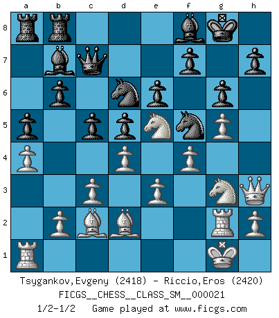Last move : 1/2-1/2 2018 December 2 15:23:45 [Event "FICGS__CHESS__CLASS_SM__000021"] [Site "FICGS"] [Date "2018.08.12"] [Round "1"] [White "Tsygankov,Evgeny"] [Black "Riccio,Eros"] [Result "1/2-1/2"] [WhiteElo "2418"] [BlackElo "2420"] 1.d4 d5 2.Nf3 Nf6 3.e3 e6 4.Nbd2 c5 5.c3 Nbd7 6.Ne5 b6 7.f4 Bb7 8.Bd3 Be7 9.O-O O-O 10.Qf3 Qc7 11.g4 Ne8 12.Qh3 Ndf6 13.g5 Ne4 14.Rf2 N8d6 15.Rg2 a5 16.a4 Nf5 17.Nf1 g6 18.Ng3 Ned6 19.Bd2 Rfb8 20.Bc2 Bf8 1/2-1/2 Queen's pawn game Kingside Castling by player White (move 9) Kingside Castling by player Black (move 9) This chess game ended in a draw. Follow this game move after move (download)It is the aim of the modern school, not to treat every position according to one general law, but according to the principle inherent in the position. (Richard Reti) Lisa Lane, amerikanische Schachmeisterin, hatte Fischer einmal als stärksten lebenden Spieler bezeichnet. Antwort: Das ist richtig, aber Lisa Lane ist eigentlich nicht in der Lage, das zu beurteilen. (Robert James Fischer) Ciertamente, de todas la drogas del mundo, el Ajedrez debe ser el mas placentero permamentemente. (Assiac) Un footballeur joue avec ses pieds, parfois avec sa tête. Un joueur d'échecs ne joue qu'avec sa tête. Et quand il ne joue plus, il meurt. (Jacob Murray) Only sick music makes money today. (Friedrich Nietzsche)