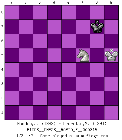 Last move : 1/2-1/2 2018 August 28 8:27:29 [Event "FICGS__CHESS__RAPID_E__000216"] [Site "FICGS"] [Date "2018.08.12"] [Round "1"] [White "Hadden,John"] [Black "Leurette,Marc-Antoine"] [Result "1/2-1/2"] [WhiteElo "1383"] [BlackElo "1291"] 1.d4 d5 2.c4 e6 3.cxd5 exd5 4.Nc3 Nf6 5.Nf3 Bb4 6.a3 Bxc3+ 7.bxc3 O-O 8.Bg5 b6 9.e3 Bg4 10.Be2 h6 11.Bxf6 Qxf6 12.O-O Nd7 13.Nd2 Bxe2 14.Qxe2 c5 15.Qb5 Qf5 16.c4 dxc4 17.Nxc4 g5 18.dxc5 Nxc5 19.Nd6 Qd7 20.Qxd7 Nxd7 21.Rfd1 Nc5 22.Rab1 f6 23.Nf5 h5 24.Rd6 Ne4 25.Re6 Nc5 26.Re7 Kh8 27.Rd1 Rad8 28.Rxd8 Rxd8 29.h3 h4 30.Rxa7 Rb8 31.Rf7 b5 32.Rxf6 b4 33.axb4 Rxb4 34.Rg6 Ne4 35.Nh6 Rb1+ 36.Kh2 Nxf2 37.g3 hxg3+ 38.Kxg3 Ne4+ 39.Kg4 Rg1+ 40.Kf5 Ng3+ 41.Kxg5 Nf1 42.Kh5 Rxg6 43.Kxg6 Nxe3 44.h4 Ng2 45.h5 Nf4+ 46.Kg5 Nxh5 47.Kxh5 Kg7 48.Nf5+ 1/2-1/2 Queen's gambit declined Kingside Castling by player Black (move 7) Kingside Castling by player White (move 12) 10 pieces endgame at move 37 : White KRNPP , Black KRNPP WHITE : King + 1 Rook 1 Knight 2 Pawns BLACK : King + 1 Rook 1 Knight 2 Pawns 9 pieces endgame at move 38 : White KRNPP , Black KRNP WHITE : King + 1 Rook 1 Knight 2 Pawns BLACK : King + 1 Rook 1 Knight 1 Pawn 8 pieces endgame at move 41 : White KRNPP , Black KRN WHITE : King + 1 Rook 1 Knight 2 Pawns BLACK : King + 1 Rook 1 Knight 7 pieces endgame at move 42 : White KNPP , Black KRN WHITE : King + 1 Knight 2 Pawns BLACK : King + 1 Rook 1 Knight 6 pieces endgame at move 43 : White KNPP , Black KN WHITE : King + 1 Knight 2 Pawns BLACK : King + 1 Knight 5 pieces endgame at move 43 : White KNP , Black KN WHITE : King + 1 Knight 1 Pawn BLACK : King + 1 Knight 4 pieces endgame at move 46 : White KN , Black KN WHITE : King + 1 Knight BLACK : King + 1 Knight 3 pieces endgame at move 47 : White KN , Black K WHITE : King + 1 Knight BLACK : King + This chess game ended in a draw. Follow this game move after move (download)The laws of Chess do not permit a free choice: you have to move whether you like it or not. (Emanuel Lasker) Jede Eröffnung ist gut genug um gespielt zu werden, wenn nur ihr Ruf schlecht genug ist. (Savielly Grigorievitsch Tartakower) El Ajedrez es sobre todo, ¡una pelea!. (Emanuel Lasker) Ce n'est pas pour s'amuser qu'il joue aux échecs : il célèbre un culte. (Vladimir Nabokov) I don't believe in psychology. I believe in good moves. (Bobby Fischer)