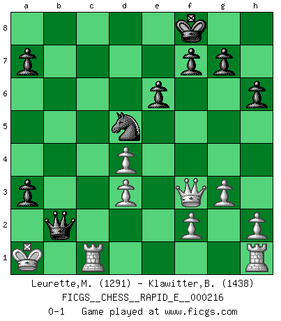 Last move : 0-1 2018 September 2 18:59:1 [Event "FICGS__CHESS__RAPID_E__000216"] [Site "FICGS"] [Date "2018.08.12"] [Round "1"] [White "Leurette,Marc-Antoine"] [Black "Klawitter,Bernd"] [Result "0-1"] [WhiteElo "1291"] [BlackElo "1438"] 1.e4 c6 2.d4 d5 3.Nc3 dxe4 4.Nxe4 Bf5 5.Nc3 Nd7 6.Nf3 e6 7.Bd2 Ngf6 8.g3 Bd6 9.Bg2 O-O 10.Qe2 Qc7 11.O-O-O b5 12.b3 Ba3+ 13.Kb1 h6 14.Bc1 b4 15.Na4 Nb6 16.Nxb6 Qxb6 17.Bxa3 bxa3 18.Ne5 Rfd8 19.Nxc6 Kf8 20.Nxd8 Rxd8 21.Qe3 Rc8 22.Rc1 Qb4 23.Bf1 Nd5 24.Qf3 Rc3 25.Bd3 Bxd3 26.cxd3 Rxb3+ 27.axb3 Qxb3+ 28.Ka1 Qb2+ 0-1 Caro-Kann : Classical variation Kingside Castling by player Black (move 9) Queenside Castling by player White (move 11) Player Black won this chess game. Follow this game move after move (download)A Chess game is a dialogue, a conversation between a player and his opponent. Each move by the opponent may contain threats or be a blunder, but a player cannot defend against threats or take advantage of blunders if he does not first ask himself: What is my opponent planning after each move ? (Bruce A. Moon) Aljechin war kein Nazi. Er war ein Opportunist. Ein schrecklicher Mann. Er liebte Geld über alles und würde für Geld ein Jude, ein Katolik oder ein Protestant werden. (Miguel Najdorf) No nos podemos resistir a la fascinación de un sacrificio ya que la pasión por los sacrificios es parte de la naturaleza de un jugador de Ajedrez. (Rudolf Spielman) Les échecs sont un jeu terrible. Si vous n'avez pas le centre, votre adversaire a une position plus libre. Par contre, si vous avez le centre, alors vous avez vraiment quelque chose pour laquelle vous inquiéter ! (Siegbert Tarrasch) Good decisions come from experience, and experience comes from bad decisions. (Anonymous)