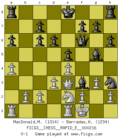 Last move : 0-1 2018 August 20 20:56:9 [Event "FICGS__CHESS__RAPID_E__000216"] [Site "FICGS"] [Date "2018.08.12"] [Round "1"] [White "MacDonald,Murdo"] [Black "Barradas,Anderson"] [Result "0-1"] [WhiteElo "1314"] [BlackElo "1234"] 1.e4 e5 2.Nf3 Nc6 3.Nc3 Nf6 4.Bb5 a6 5.Bxc6 bxc6 6.O-O d6 7.d3 Be7 8.Bg5 Bg4 9.a4 h6 10.Bh4 Nh7 11.Qd2 Bxf3 12.g3 Bxh4 13.Qe3 Ng5 14.Rfe1 Qf6 15.Ne2 Nh3+ 16.Kf1 Bg5 0-1 Four knights : Ranken variation Kingside Castling by player White (move 6) Player Black won this chess game. Follow this game move after move (download)The older I grow, the more I value pawns. (Paul Keres) Ich glaube, ich kenne inzwischen die Gründe für mein Versagen: schachliche Charakterfehler. Ich war nie ein Wunderkind und in meiner gesamten menschlichen Entwicklung immer zu langsam. (Viktor Kortschnoi) El juego de Fischer siempre fue nítido, racional y brillante. Uno de los mejores por siempre. (Dave Regis) Fischer est le meilleur joueur du monde et Karpov n'est qu'un joueur de bistrot. (Garry Kasparov, agé de 16 ans) Beep ! (R2D2 in Star Wars ep.3)