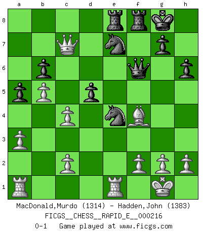 Last move : 0-1 2018 August 31 22:54:43 [Event "FICGS__CHESS__RAPID_E__000216"] [Site "FICGS"] [Date "2018.08.12"] [Round "1"] [White "MacDonald,Murdo"] [Black "Hadden,John"] [Result "0-1"] [WhiteElo "1314"] [BlackElo "1383"] 1.e4 e5 2.Nf3 Nc6 3.Nc3 Nf6 4.Bc4 h6 5.O-O Bb4 6.a3 Bxc3 7.dxc3 d6 8.Be3 Be6 9.Bxe6 fxe6 10.b4 d5 11.exd5 exd5 12.Bc5 b6 13.Be3 Qd6 14.Re1 a5 15.b5 Ne7 16.c4 Qd7 17.Nxe5 Qe6 18.Bf4 O-O 19.Ng6 Ne4 20.Qh5 Qxg6 21.Qe5 Qf6 22.Qxc7 Rae8 0-1 Four knights : Italian variation Kingside Castling by player White (move 5) Kingside Castling by player Black (move 18) Player Black won this chess game. Follow this game move after move (download)Those who say they understand Chess, understand nothing. (Robert Hubner) Herr Iljumschinow ist ein etwas merkwürdiger Geschäftsmann: Er arbeitet zusammen mit Leuten wie Muammar al-Gaddafi; früher ist das Saddam Hussein gewesen. (Joel Lautier) Todo se encuentra en un estado de flujo y esto incluye al mundo del Ajedrez. (Mikhail Botvinnik) Aidez vos pièces, elles vous aideront. (Paul Morphy) Unless I accept my faults I will most certainly doubt my virtues. (Hugh Prather)