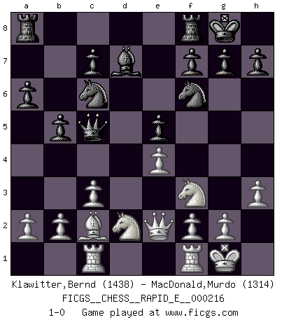 Last move : 1-0 2018 August 31 22:54:30 [Event "FICGS__CHESS__RAPID_E__000216"] [Site "FICGS"] [Date "2018.08.12"] [Round "1"] [White "Klawitter,Bernd"] [Black "MacDonald,Murdo"] [Result "1-0"] [WhiteElo "1438"] [BlackElo "1314"] 1.e4 d6 2.d4 e5 3.dxe5 dxe5 4.Nf3 Nc6 5.Bb5 Bd7 6.c3 Nf6 7.Bg5 Be7 8.Nbd2 O-O 9.O-O Ng4 10.Bxe7 Qxe7 11.h3 Nf6 12.Qe2 a6 13.Ba4 b5 14.Bc2 Qc5 15.Rac1 1-0 King's pawn Opening Kingside Castling by player Black (move 8) Kingside Castling by player White (move 9) Player White won this chess game. Follow this game move after move (download)The chessboard is the world, the pieces are the phenomena of the Universe, the rules of the game are what we call the laws of Nature and the player on the other side is hidden from us. (Thomas Huxley) Kasparov stellt für gewöhnlich die Regeln auf und bricht sie dann selbst wieder. (Alexej Shirov) Un Peón pasado aumenta su poder a medida de que el número de piezas en el tablero disminuye. (Capablanca) Vous n'êtes pas toujours obligé de jouer le meilleur coup. Un coup doit être actif, entreprenant, correct et beau ! (David Bronstein) The weakness of an artist is dogma. (Josh Waitzkin)