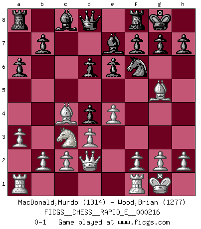 Last move : 0-1 2018 October 8 7:18:15 [Event "FICGS__CHESS__RAPID_E__000216"] [Site "FICGS"] [Date "2018.08.12"] [Round "1"] [White "MacDonald,Murdo"] [Black "Wood,Brian"] [Result "0-1"] [WhiteElo "1314"] [BlackElo "1277"] 1.e4 c5 2.Nf3 d6 3.Bc4 e6 4.Nc3 Nf6 5.O-O Be7 6.d3 O-O 7.Bg5 a6 8.Qd2 Nc6 9.a3 Nd4 10.Nxd4 cxd4 0-1 This chess game has been lost on time (started : 2018.08.12 20:56:58) Sicilian Kingside Castling by player White (move 5) Kingside Castling by player Black (move 6) Player Black won this chess game. Follow this game move after move (download)Bobby is the finest Chess player this country ever produced. His memory for the moves, his brilliance in dreaming up combinations, and his fierce determination to win are uncanny. (John Collins) Gewinnen beim Schach fördert das Selbstvertrauen. Beim Sex spüre ich sowas nicht... (Garry Kasparov) La caracteristica mas importante en la posición del Ajedrez es la actividad de las piezas. Esto es absolutamente fundamental en todas las fases del juego: Apertura, Juego Medio y especialmente Finales. La limitación primordial en la actividad de una pieza, es la estructuración de los Peones. (Michael Stean) Le thème de l'attaque double intervient d'une manière ou d'une autre dans l'immense majorité des combinaisons. (Youri Averbakh) There are two major products that came out of Berkeley: LSD and UNIX. We do not believe this is to be a coincidence. (Jeremy S. Anderson)