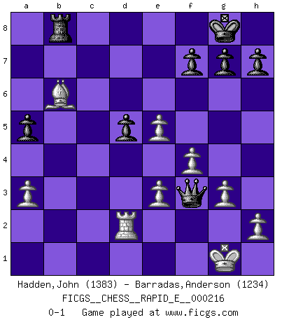 Last move : 0-1 2018 August 26 0:8:59 [Event "FICGS__CHESS__RAPID_E__000216"] [Site "FICGS"] [Date "2018.08.12"] [Round "1"] [White "Hadden,John"] [Black "Barradas,Anderson"] [Result "0-1"] [WhiteElo "1383"] [BlackElo "1234"] 1.d4 Nf6 2.e3 d5 3.c4 c6 4.cxd5 cxd5 5.Nc3 e6 6.Nf3 Bb4 7.a3 Bxc3+ 8.bxc3 O-O 9.Bd3 Nc6 10.c4 b6 11.cxd5 exd5 12.O-O a5 13.Qb3 Be6 14.Bb5 Rc8 15.Ne5 Nxe5 16.dxe5 Ne4 17.Qd1 Nc3 18.Qd3 Qg5 19.Bb2 Bh3 20.g3 Bxf1 21.Qxf1 Nxb5 22.Qxb5 Qd8 23.Rd1 Rc5 24.Qe2 Qg5 25.f4 Qg6 26.Bd4 Rc2 27.Rd2 Rc1+ 28.Kg2 Qe4+ 29.Qf3 Rg1+ 30.Kxg1 Qxf3 31.Bxb6 Rb8 0-1 Queen's pawn game Kingside Castling by player Black (move 8) Kingside Castling by player White (move 12) Player Black won this chess game. Follow this game move after move (download)For me, Chess is life and every game is like a new life. Every Chess player gets to live many lives in one lifetime. (Eduard Gufeld) Wer mein Gambit spielt, muß bereit sein, alle Brücken hinter sich abzubrechen. Es verändert den ganzen Menschen. Es wirkt wie ein Zauberstab und fördert verkümmerte, gute Charakter- eigenschaften wieder zu Tage. (Emil Joseph Diemer) Yo siempre he tenido un ligero sentimiento de lástima por una persona que no tiene conocimiento del Ajedrez. (Siegbert Tarrasch) Aux échecs, les retours au sommet sont rares : les dommages psychologiques consécutifs à une défaite sont trop sévères. (Daily Telegraph) See no evil, hear no evil, speak no evil. (The 3 monkeys)