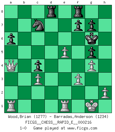 Last move : 1-0 2018 October 4 6:8:23 [Event "FICGS__CHESS__RAPID_E__000216"] [Site "FICGS"] [Date "2018.08.12"] [Round "1"] [White "Wood,Brian"] [Black "Barradas,Anderson"] [Result "1-0"] [WhiteElo "1277"] [BlackElo "1234"] 1.Nf3 Nc6 2.e4 e5 3.Bb5 a6 4.Ba4 Nf6 5.O-O Nxe4 6.d4 b5 7.Bb3 d5 8.dxe5 Be6 9.c3 Be7 10.Nbd2 Nxd2 11.Bxd2 O-O 12.Re1 h6 13.a4 Na7 14.axb5 Nxb5 15.Be3 c5 16.Ba4 Nc7 17.Bc2 c4 18.b3 Qc8 19.Nd4 Bg4 20.f3 Bh5 21.Nf5 Bg5 22.Bxg5 hxg5 23.g4 Qe6 24.Ng3 Bg6 25.Bxg6 Qxg6 26.bxc4 Rad8 27.Nf5 dxc4 28.Ne7+ Kh7 29.Nxg6 Kxg6 30.Qa4 1-0 Reti Opening Kingside Castling by player White (move 5) Kingside Castling by player Black (move 11) Player White won this chess game. Follow this game move after move (download)Chess demands total concentration. (Bobby Fischer) Schach ist eine Sache der genauen Beurteilung, wann man zuschlagen und wann man sich ducken muss. (Robert James Fischer) ¿Esta Bobby Fischer algo cuerdo?. (Salo Flohr) Toutes les manuvres exécutées sur une colonne ouverte ont pour but ultime l'intrusion définitive sur la septième ou la huitième rangée, en plein cur de la position ennemie. (Aaron Nimzovitch) You can only get smarter by playing a smarter opponent. (Revolver, movie)