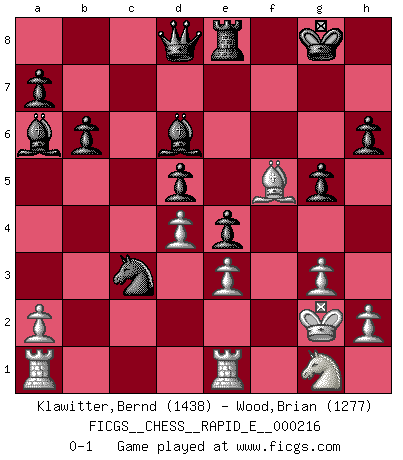 Last move : 0-1 2018 October 7 16:43:59 [Event "FICGS__CHESS__RAPID_E__000216"] [Site "FICGS"] [Date "2018.08.12"] [Round "1"] [White "Klawitter,Bernd"] [Black "Wood,Brian"] [Result "0-1"] [WhiteElo "1438"] [BlackElo "1277"] 1.d4 f5 2.Nf3 Nf6 3.e3 e6 4.g3 Be7 5.Bg2 d5 6.c3 O-O 7.O-O c5 8.Nbd2 Nc6 9.dxc5 Bxc5 10.Nb3 Bd6 11.Bd2 e5 12.Be1 Re8 13.Ng5 e4 14.Nd4 Nxd4 15.cxd4 b6 16.Bc3 Ba6 17.Re1 h6 18.Nh3 Rc8 19.Kh1 g5 20.Ng1 Ng4 21.Bh3 Nxf2+ 22.Kg2 Nxd1 23.Bxf5 Rxc3 24.bxc3 Nxc3 0-1 Dutch Kingside Castling by player Black (move 6) Kingside Castling by player White (move 7) Player Black won this chess game. Follow this game move after move (download)Chess is a more highly symbolic game, but the aggressions are therefore even more frankly represented in the play. It probably began as a war game; that is, the representation of a miniature battle between the forces of two kingdoms. (Karl Meninger) Ja, jede Frau in Holland liebt mich bestimmt, und alle Männer hassen mich. (Loek van Wely) El juego del Ajedrez no es solamente una diversión quieta; algunas cualidades muy valuables de la mente se pueden adquirir y cultivar con el, como convertirlos en habitos disponibles para toda ocasión; ya que la vida es algo así como el Ajedrez. (Benjamin Franklin) La vérité est comme le meilleur coup aux échecs : elle existe, mais il faut la chercher. (Arturo Perez-Reverte) The right perception of any matter and a misunderstanding of the same matter do not wholly exclude each other. (Kafka's the trial)