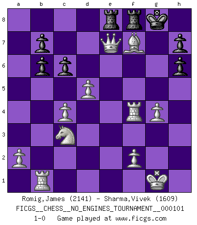 Last move : 1-0 2018 August 15 7:6:5 [Event "FICGS__CHESS__NO_ENGINES_TOURNAMENT__000101"] [Site "FICGS"] [Date "2018.08.13"] [Round "1"] [White "Romig,James"] [Black "Sharma,Vivek"] [Result "1-0"] [WhiteElo "2141"] [BlackElo "1609"] 1.e4 e5 2.Nf3 Nc6 3.Bb5 d5 4.Nxe5 dxe4 5.Nxc6 Qd6 6.Na5 c6 7.Be2 Nf6 8.Nc4 Qe6 9.O-O Bc5 10.d4 Bb6 11.Nxb6 axb6 12.c4 O-O 13.Nc3 Ng4 14.h3 Nh6 15.d5 Qg6 16.Bh5 Qf5 17.Re1 Re8 18.g4 Qe5 19.Rxe4 Bxg4 20.hxg4 Qd6 21.Bf4 Qb4 22.Bxh6 gxh6 23.Rf4 Rf8 24.Qd4 Qxb2 25.Rb1 Qa3 26.Qf6 Qe7 27.Qxe7 Rae8 28.Bxf7+ 1-0 Ruy Lopez (Spanish Opening) Kingside Castling by player White (move 9) Kingside Castling by player Black (move 12) Player White won this chess game. Follow this game move after move (download)Chess is as much a mystery as women. (Purdy) Modernes Schach erfordert enorme Anspannung. Es ist für einen normalen Menschen unmöglich das auszuhalten. (Viktor Kortschnoi) Cuando le juegas a Fischer, no es una cuestion de si vas a ganar o perder. Es una cuestion de si vas a sobrevivir. (Boris Spassky) Je crois qu'il existe des manières très spécifiques de jouer efficacement contre une machine. Evidemment, nous n'avons aucune chance en technique pure, parce que l'ordinateur calcule de manière parfaite. Mais lorsque nous faisons appel à notre cerveau, en utilisant l'intuition et la compréhension, alors nous restons beaucoup plus forts. (Anatoli Karpov) Statistics can be made to prove anything - even the truth. (Author unknown)