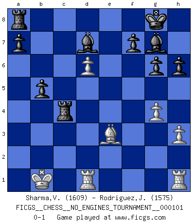 Last move : 0-1 2018 November 19 11:3:13 [Event "FICGS__CHESS__NO_ENGINES_TOURNAMENT__000101"] [Site "FICGS"] [Date "2018.08.13"] [Round "1"] [White "Sharma,Vivek"] [Black "Rodriguez,Juan Antonio"] [Result "0-1"] [WhiteElo "1609"] [BlackElo "1575"] 1.e4 e5 2.f4 d6 3.Nf3 exf4 4.d4 g6 5.Nc3 Bg7 6.Bxf4 Bg4 7.Qe2 Bxd4 8.Qc4 Bg7 9.Be2 Nf6 10.O-O-O O-O 11.Kb1 Qe7 12.h3 Be6 13.Nd5 Nxd5 14.exd5 Bc8 15.g4 h6 16.Nh4 Qf6 17.c3 Qxh4 18.Qxc7 Re8 19.Bb5 Qd8 20.Bxd6 Qxc7 21.Bxc7 Bd7 22.Bc4 b5 23.Bb3 Na6 24.d6 Nc5 25.c4 Nxb3 26.axb3 Re2 27.Ba5 Rxb2+ 28.Kc1 Rxb3 29.c5 Ra3 30.Bb4 Ra4 31.Bd2 Rc4+ 32.Kb1 Rxc5 33.Be3 Rc4 0-1 King's gambit Queenside Castling by player White (move 10) Kingside Castling by player Black (move 10) Player Black won this chess game. Follow this game move after move (download)I played Chess with him and would have beaten him sometimes only he always took back his last move, and ran the game out differently. (Mark Twain) Wenn ich gewinne bin ich ein Genie. Wenn nicht, dann bin ich keines. (Robert James Fischer) Hoy en día, si tu no eres un Gran Maestro a los 14 años, es mejor que lo olvides. (Anand Viswanathan) Votre seul travail dans les ouvertures est d'obtenir un milieu de partie jouable. (Lajos Portish) Mac users swear by their computers. PC users swear at their computers. (Author unknown)