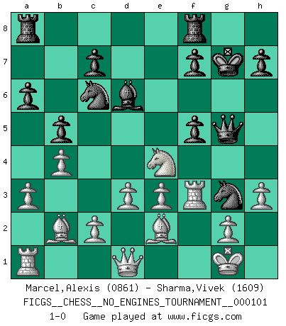 Last move : 1-0 2018 August 16 9:37:5 [Event "FICGS__CHESS__NO_ENGINES_TOURNAMENT__000101"] [Site "FICGS"] [Date "2018.08.13"] [Round "1"] [White "Marcel,Alexis"] [Black "Sharma,Vivek"] [Result "1-0"] [WhiteElo "0861"] [BlackElo "1609"] 1.f4 d5 2.Nf3 Nf6 3.b3 Nc6 4.Bb2 Bg4 5.e3 e6 6.Be2 Bb4 7.a3 Bd6 8.O-O O-O 9.Nc3 a6 10.b4 b5 11.h3 Bf5 12.Nh4 Ne4 13.Nxf5 exf5 14.Nxd5 Qh4 15.d3 Ng3 16.Rf3 g5 17.fxg5 Qxg5 18.Nf6+ Kg7 19.Ne4 1-0 Bird's Opening Kingside Castling by player White (move 8) Kingside Castling by player Black (move 8) Player White won this chess game. Follow this game move after move (download)I like to say that Bobby Fischer was the greatest player ever. But what made Fischer a genius was his ability to blend an American freshness and pragmatism with Russian ideas about strategy. (Bruce Pandolfini) Das typische an einem Großmeister ist, daß er eine gewonnene Position schnell und schmerzlos gewinnt. (Irving Chernev) No es una movida, aún la mejor movida que tu debas buscar, sino un plan comprensible. (Eugene Znosko-Borovsky) Il s'avisa de me proposer d'apprendre les échecs qu'il jouait un peu... me voilà forcené des échecs. J'achète un échiquier, je m'enferme dans ma chambre, j'y passe des jours et des nuits à vouloir apprendre par cur toutes les parties. (Jean-Jacques Rousseau, Confessions) The only difference between a tax man and a taxidermist is that the taxidermist leaves the skin. (Mark Twain)