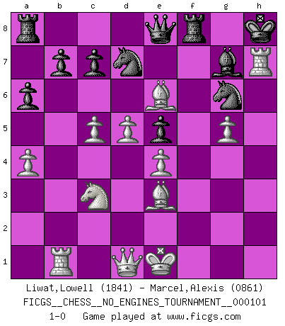 Last move : 1-0 2018 August 17 10:15:20 [Event "FICGS__CHESS__NO_ENGINES_TOURNAMENT__000101"] [Site "FICGS"] [Date "2018.08.13"] [Round "1"] [White "Liwat,Lowell"] [Black "Marcel,Alexis"] [Result "1-0"] [WhiteElo "1841"] [BlackElo "0861"] 1.d4 f5 2.c4 Nf6 3.Nc3 g6 4.f3 Bg7 5.e4 fxe4 6.fxe4 d6 7.Be2 O-O 8.g4 Nc6 9.Be3 e5 10.d5 Ne7 11.g5 Nd7 12.b4 Nb6 13.c5 Nd7 14.a4 a6 15.h4 Nb8 16.Nh3 dxc5 17.bxc5 Bxh3 18.Rxh3 Nd7 19.Rb1 Qc8 20.Bg4 Qe8 21.Be6+ Kh8 22.h5 gxh5 23.Rxh5 Ng6 24.Rxh7+ 1-0 Dutch with c4 & Nc3 Kingside Castling by player Black (move 7) Player White won this chess game. Follow this game move after move (download)If cunning alone were needed to excel, women would be the best Chess players. (Albin) Es gibt nur zwei wahre Schachgenies - das andere war Wilhelm Steinitz, der Weltmeister von 1872 bis 1894. (Robert James Fischer) El ganar no lo es todo... pero el perder es nada. (Mednis) Il n'y a pas de prix trop élevé au scalp de l'ennemi. (Koblentz) He is a liar. I just don't know what the lie is yet. (Horatio Caine, C.S.I. Miami)