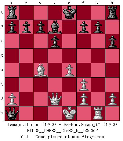 Last move : 0-1 2006 June 26 11:45:56 [Event "FICGS__CHESS__CLASS_G__000002"] [Site "FICGS"] [Date "2006.06.07"] [Round "1"] [White "Tamayo,Thomas"] [Black "Sarkar,Soumojit"] [Result "0-1"] [WhiteElo "1200"] [BlackElo "1200"] 1.e4 e5 2.Nf3 Nc6 3.Bc4 Nf6 4.d3 Bc5 5.Bg5 d6 6.c3 h6 7.Bxf6 Qxf6 8.Qa4 Bd7 9.d4 exd4 10.cxd4 Nxd4 11.Qd1 Nxf3+ 12.gxf3 Qxb2 13.Nd2 Bb4 14.Rg1 Bxd2+ 15.Qxd2 Qxa1+ 0-1 Two knights defense (Modern Bishop's Opening) Player Black won this chess game. Follow this game move after move (download)No Chess Grandmaster is normal; they only differ in the extent of their madness. (Viktor Korchnoi) Kostenjuk hat keinen Sexappeal. (Loek van Wely) El Ajedrez es el gimnasio de la mente. (Blaise Pascal) On croit qu'il y a plus de mauvais joueurs que de bons joueurs, c'est faux : Il y a autant de joueurs qui gagnent que de joueurs qui perdent. (Philippe Geluck) Life is pain my dear and anyone who says otherwise is selling something. (Princess Bride)