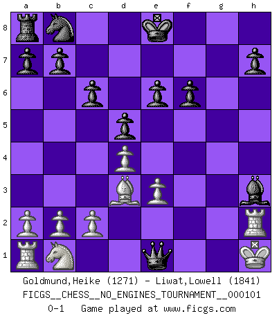 Last move : 0-1 2018 August 26 11:35:1 [Event "FICGS__CHESS__NO_ENGINES_TOURNAMENT__000101"] [Site "FICGS"] [Date "2018.08.13"] [Round "1"] [White "Goldmund,Heike"] [Black "Liwat,Lowell"] [Result "0-1"] [WhiteElo "1271"] [BlackElo "1841"] 1.e4 c6 2.d4 Nf6 3.e5 Nd5 4.Nf3 d6 5.Bc4 Bg4 6.Qd3 e6 7.Bg5 f6 8.exf6 gxf6 9.Bh4 Bh6 10.O-O Nf4 11.Qe3 Nh3+ 12.gxh3 Bxe3 13.fxe3 Bxh3 14.Rf2 Rg8+ 15.Bg3 d5 16.Bd3 Qc7 17.Kh1 Rxg3 18.hxg3 Qxg3 19.Rh2 Qxf3+ 20.Kg1 Qg3+ 21.Kh1 Qe1+ 0-1 Caro-Masi defense Kingside Castling by player White (move 10) Player Black won this chess game. Follow this game move after move (download)My God, Bobby Fischer plays so simply. (Alexei Suetin) Ich verachte Kasparow. (Viktor Kortschnoi) Con o sin el título, Bobby Fischer fue sin lugar a dudas el mas grande jugador de su época. (Burt Hochberg) Les Echecs représentent une sphère d'idées créatrices basée sur la volonté des deux protagonistes. (Smyslov) Lottery : A tax on people who are bad at math. (Author unknown)